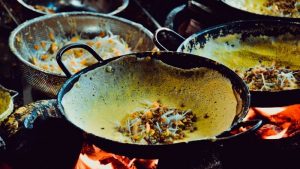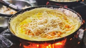 Khi tránh bánh cũng nên để lửa to vừa, xoay đều chảo để bột lan đều, nhớ thêm dầu mỡ để bánh giòn, không dính.