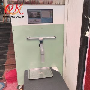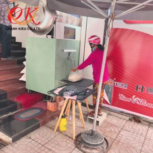 Máy hoạt động rất khoa học, mỗi người trước khi nhận gạo phải tuân thủ nguyên tắc 5K của chính phủ. Xếp hàng giãn cách 2m, mặt đất được kẻ sẵn ô, để người dân tự bước theo vạch chỉ dẫn. Sau đó, họ sẽ được khử khuẩn để tránh tiếp xúc khi cầm bọc và bước cuối cùng là tới quầy nhận gạo.