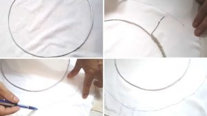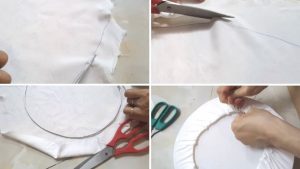 Bạn đặt khuôn lên vải rồi dùng bút kẻ đường tròn lên vải, có bán kính lớn hơn khuôn khoảng 3cm rồi dùng kéo cắt vải theo đường đã vẽ.